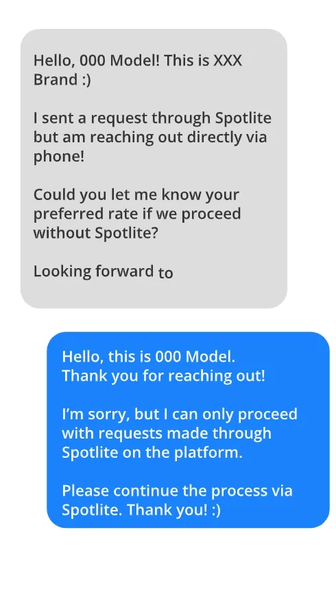 Without confirmation through Spotlite, proper documentation of agreed terms may be missing, leaving both parties unprotected.For clients, this also means there’s no recourse if a model arrives at the shoot unprepared (e.g., with altered hair), is late, or fails to show up without a proper contract.