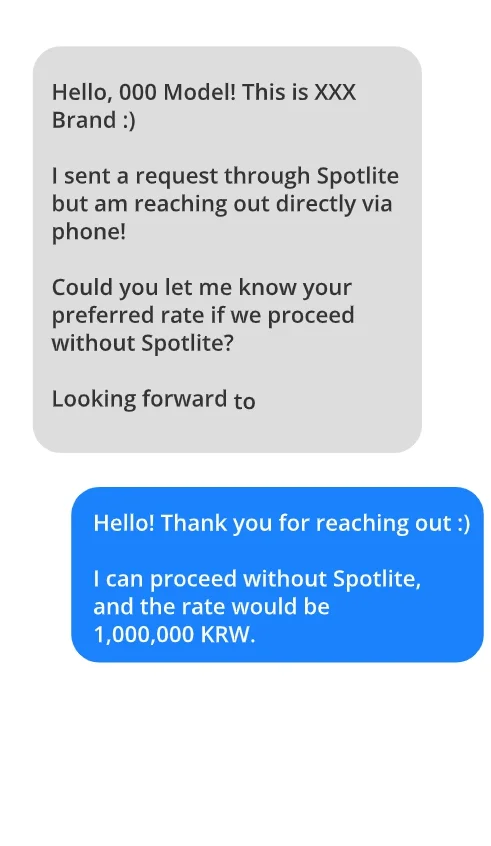 "Hi [OOO]! This is [XXXX] from Spotlite. I’m reaching out via Instagram as shared. Could we agree on a direct payment of 1,000,000 KRW without the platform fee? We’ll make sure to pay you promptly!"