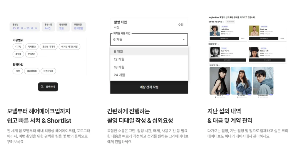 덕분에 광고주가 원하는 핏의 모델을 전보다 더 찾을 기회가 많아졌죠. 하지만 그만큼 모델 비교 및 선정까지 드는 리소스가 커졌습니다. 비효율적인 커뮤니케이션과 섭외 프로세스로 인해 광고주와 모델, 에이전시 모두에게 피로감이 생길 수 있습니다.