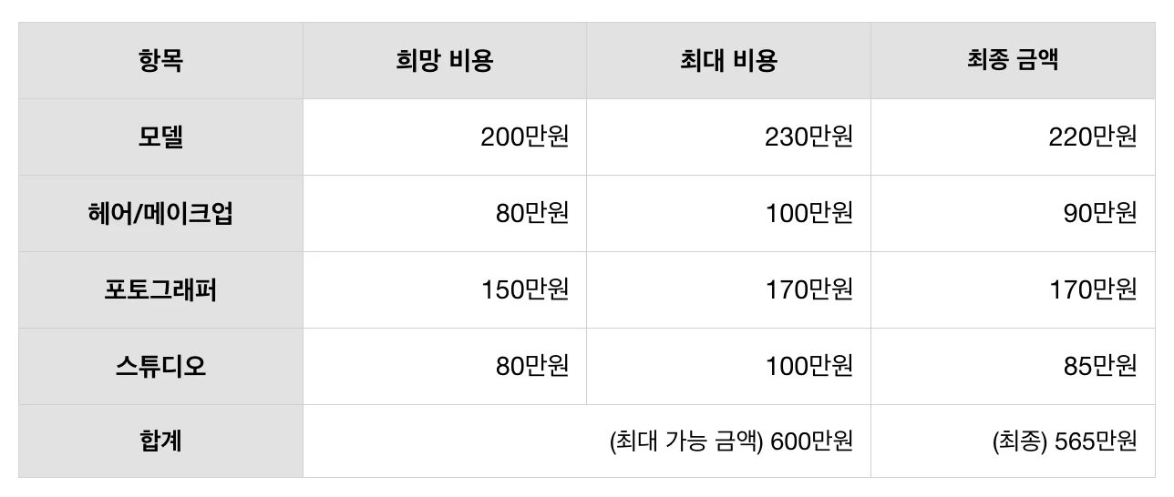 촬영에 필요한 섭외 리스트를 작성했다면, 섭외 항목 별로 예산을 짜는 게 중요해요. 룩북 촬영에 사용할 수 있는 총예산이 정해졌다면 각 항목(모델, 헤어/메이크업, 포토그래퍼 등) 별 희망 비용과 최대 비용을 설정해 주세요. (표는 이해를 돕기 위한 단순 예시입니다)