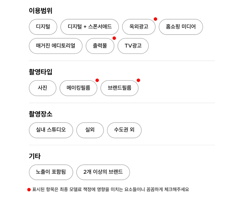 이용범위에 해당하는 옥외광고와 출력물, 촬영 타입에 해당하는 메이킹필름과 브랜드필름은 최종 모델료 책정에 영향을 미치는 요소들입니다. 촬영 조건에 따라 해당 항목을 꼼꼼하게 체크해 주세요.