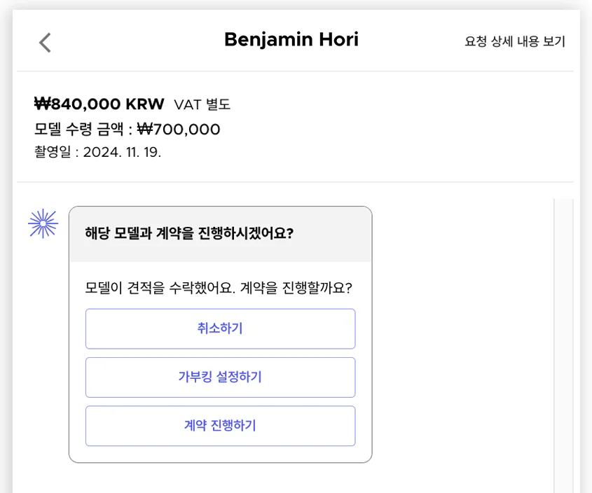 모델과 계약을 진행하기 위해 '가부킹 설정하기' 혹은 '계약 진행하기' 버튼을 눌러야 합니다. 가부킹은 모델에게 일정을 확인하고 예약하는 단계입니다.촬영 계획은 있지만 세부내용이 아직 정해지지 않았을 경우 가부킹 설정하기를 클릭해 주세요.
